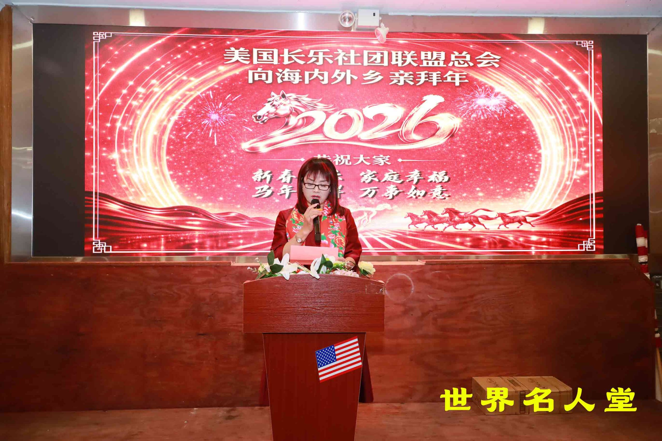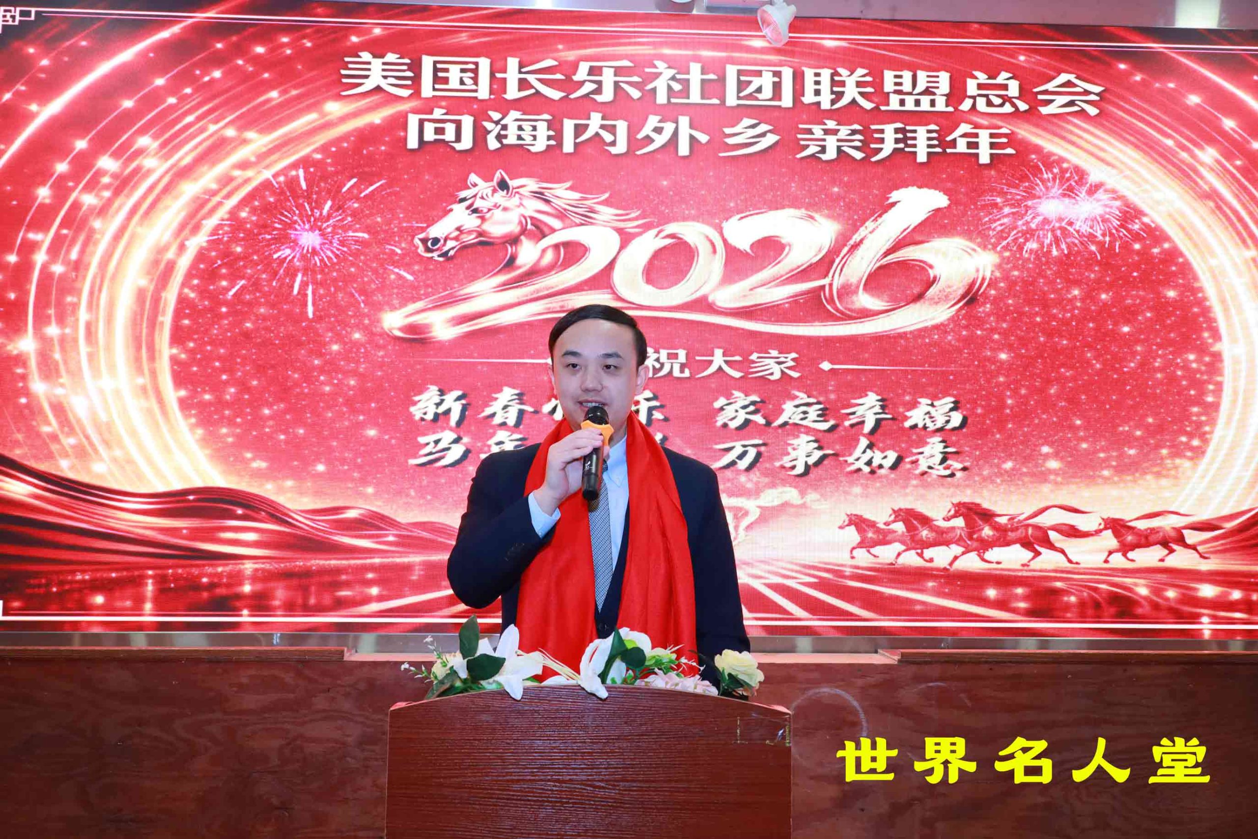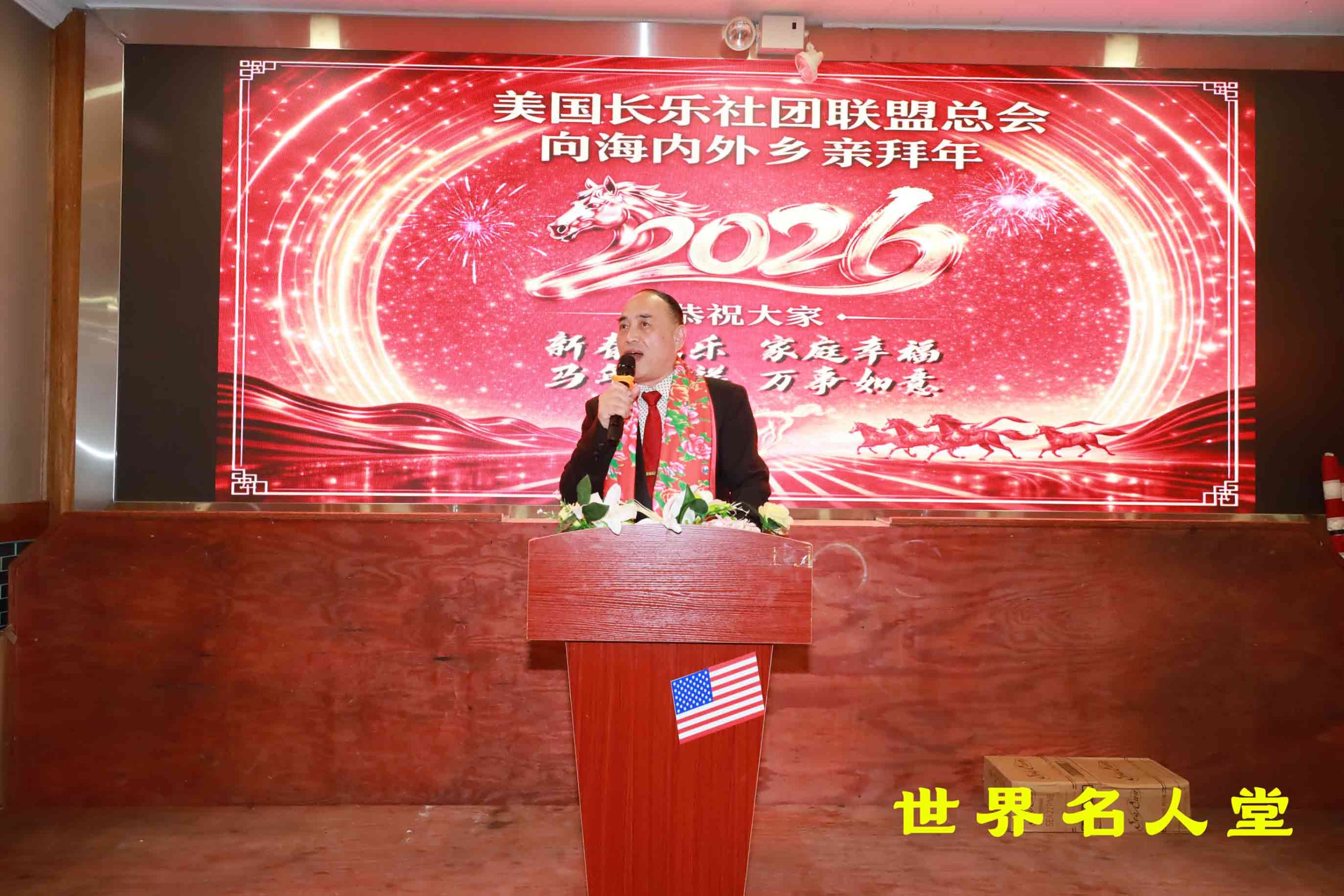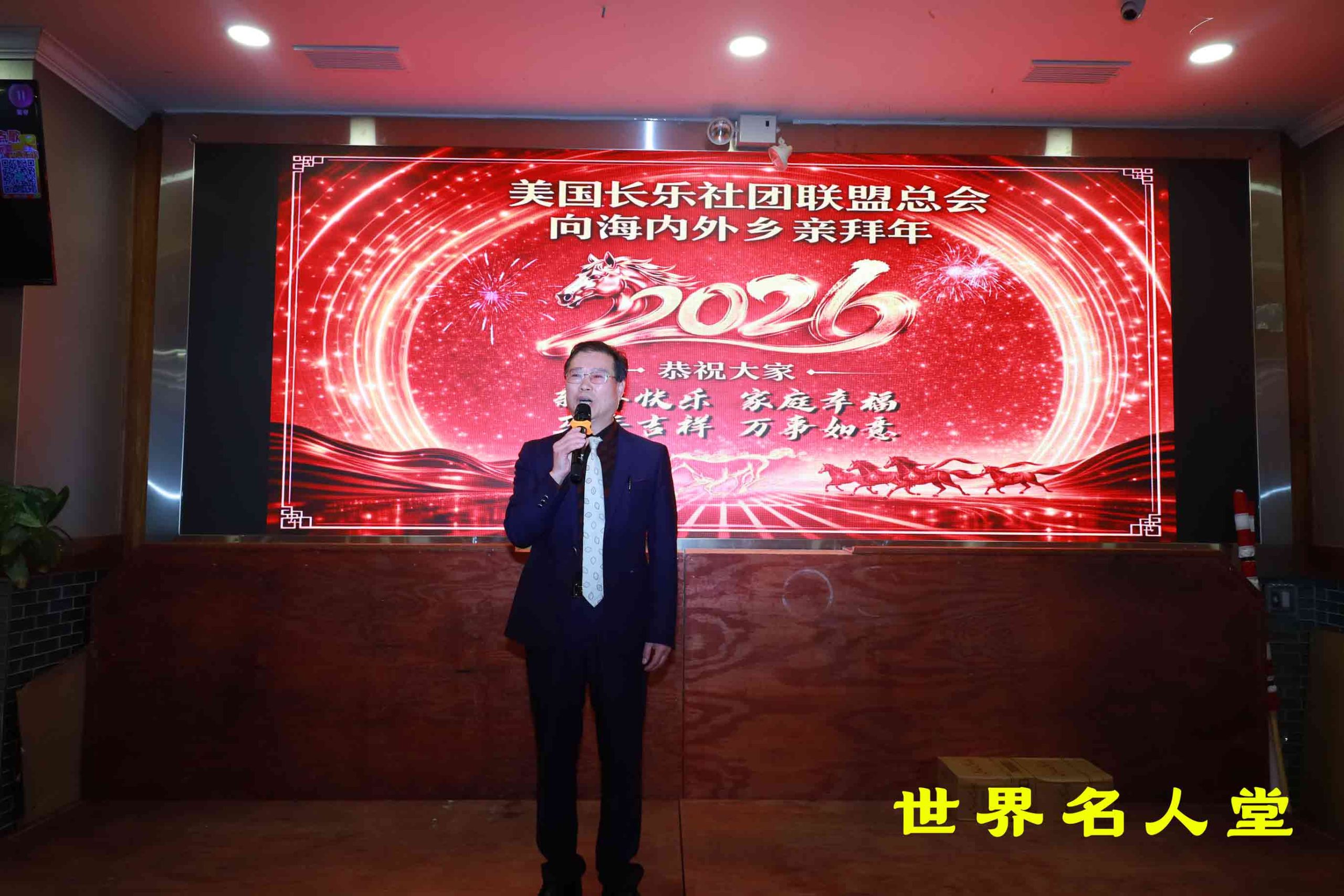 靈蛇辭歲去,駿馬踏春來。在這辭舊迎新、萬家團圓的美好時刻,我們歡聚一堂,共同舉辦美國長樂社團聯盟總會馬年新春團拜會。在此,我謹代表聯盟總會,向長期關心和支持我們總會發展的各界朋友,向辛勤付出的各位會長、僑領、義工以及所有鄉親們,致以最誠摯的新春問候和最美好的祝福!祝大家新春快樂、身體健康、闔家幸福、馬年吉祥、萬事如意!